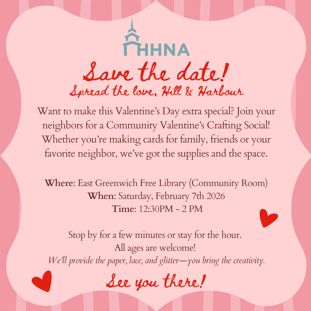 The Hill & Harbour Neighborhood Association (HHNA) is a volunteer organization created to promote public safety and civic awareness, to connect neighbors, as well as to organize community events and beautification projects in the historic Hill & Harbour District of East Greenwich, RI. The HHNA as an organization shall remain neutral on town initiatives and capital projects, except as they pertain to public safety.